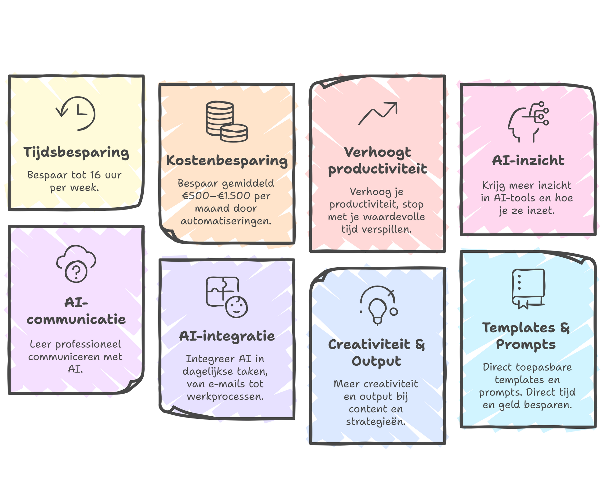 Leer in kleine groepen en met 1 op 1 begeleiding van ervaren AI-trainers. Geen standaard cursus, maar maatwerk dat bij jou past. Wat dit betekent voor jou: